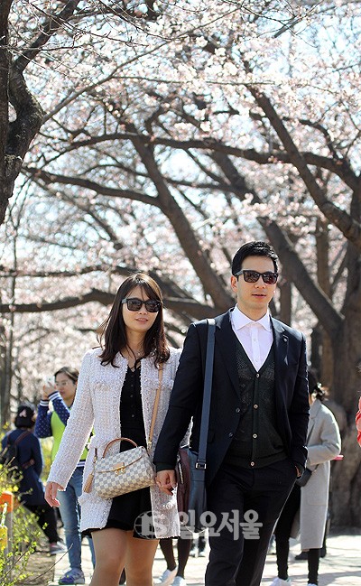 여의도 봄꽃축제가 시작된 4일 국회의사당 옆윤중로를 찾은 시민들이 벚꽃길을 걸으며 봄을 즐기고 있다. 2016 여의도 봄꽃축제는 오는 10일까지 계속된다.