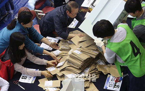 제 20대 국회의원 선거날인 13일 오후 서울 중구 광희동 중구구민회관에 마련된 개표소에 선거관리위원회 관계자들이 투표함을 열고 있다.