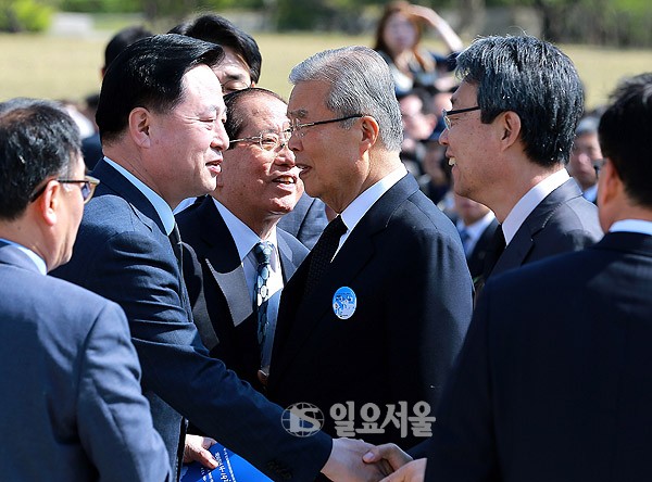 김두관 더불어민주당 당선자가 19일 오전 서울 강북구 수유동 국립 4.19민주묘지에서 열린 제56주년 4.19혁명 기념식에서 국민의당 김성식 당선자와 악수를 하고 있다.