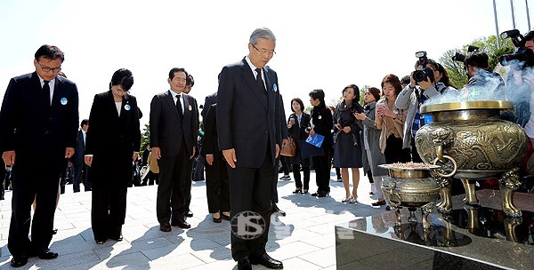 김종인 더불어민주당 비상대책위 대표가 19일 오전 서울 강북구 수유동 국립 4.19민주묘지에서 열린 제56주년 4.19혁명 기념식에서 묵념을 하고 있다.