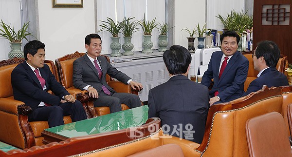 원유철 새누리당 원내대표가 19일 국회에서 '새누리당혁신모임' 소속 오신환, 황영철, 하태경, 김영우 의원을 만나 대화하고 있다.