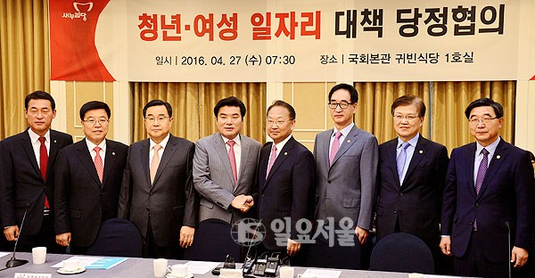 새누리당 원유철 원내대표 등 참석자들이 27일 오전 국회 귀빈식당에서 열린 청년ㆍ여성 일자리 대책 당정협의에 앞서 기념촬영을 하고 있다. 오른쪽부터 이기권 고용노동부 장관, 최양희 미래창조과학부 장관, 이준식 부총리 겸 교육부 장관, 유일호 부총리 겸 기획재정부 장관, 원 원내대표, 김정훈 정책위의장, 김광림, 황영철 정책위 부의장, 이현재 민생119본부 부본부장.