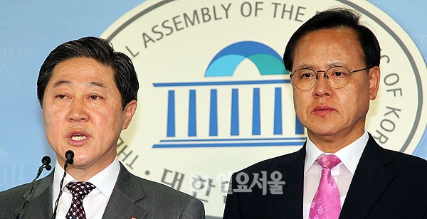 유기준 새누리당 의원이 28일 서울 여의도 국회 정론관에서 기자회견을 열고 차기 원내대표 출마를 공식 선언하며 정책위의장 러닝메이트인 이명수 의원과 함께 포부를 밝히고 있다.
