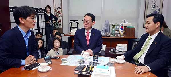 새누리당 김도읍(가운데), 더불어민주당 박완주(왼쪽), 국민의당 김관영 여야 3당 원내수석부대표가 10일 서울 여의도 국회 의원회관에서 박근혜 대통령과 여야 신임 원내지도부 회동 의제 조율을 위한 논의를 하고 있다.