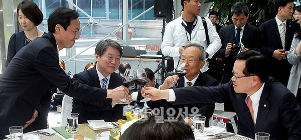 11일 서울 여의도 국회 의원회관에서 열린 국회의장 주최 제20대 국회 초선의원 의정연찬회 오찬에서 야당 지도부들이 건배를 하고 있다.