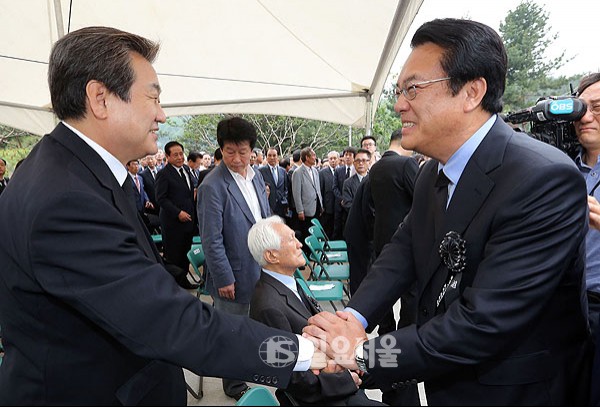 26일 오후 동작동 국립현충원에서 열린 고 김영삼 전 대통령 묘비 제막식에서 김무성 전 새누리당 대표가 정진석 새누리당 원내대표가 인사를 나누고 있다.