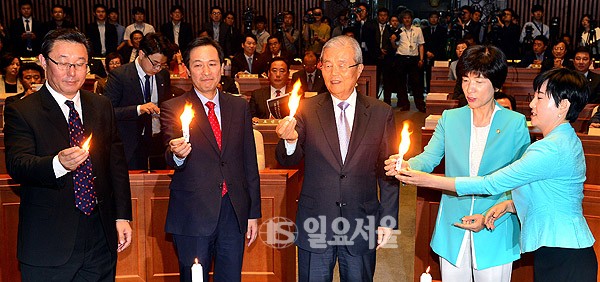 더불어민주당 김종인 비상대책위 대표와 우상호 원내대표가 30일 오전 국회에서 열린 제20대 국회 첫 의원총회에서 부실채권을 소각하고 있다.