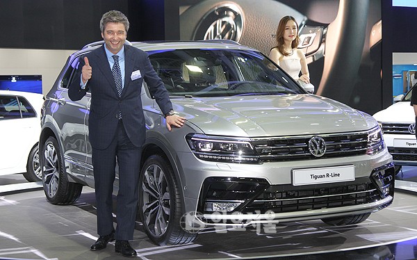 2일 부산 벡스코에서 열린 2016부산국제모터쇼에서 토마스 쿨 폭스바겐코리아 사장이 티구안 앞에서 포즈를 취하고있다. 모터쇼는 오는 12일까지 계속된다. 일요서울 정대웅 기자