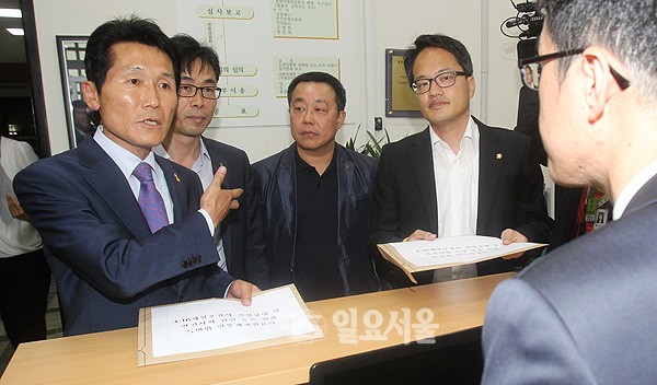 박주민 더불어민주당 의원과 윤소하 정의당 의원이 세월호 유가족과 함께 7일 국회 의안과에 세월호특별법 개정안을 제출하고 있다.