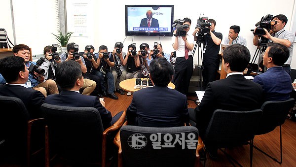 더불어민주당 김영춘 의원을 비롯한 부산 지역 의원들이 21일 오후 국회 원내대표실에서 영남권 신공항 건설 발표를 TV를 통해 지켜보고 있다.