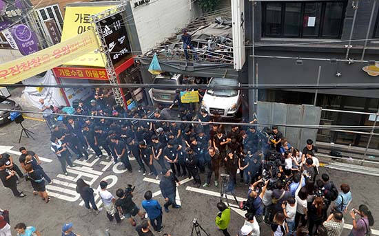▲ 지난 7일 서울 강남구 가로수길 리쌍 건물 강제집행 현장<뉴시스>