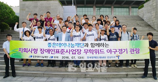 계속되는 무더위 가운데 13일 창원시 마산회원구 마산야구장에서 열린 프로야구 NC다이노스와 두산 베어스 경기를 관람 이들은 최재호 무학 회장과 임직원, 좋은데이나눔재단 관계자, 이승용 한국장애인고용공단 경남지사장 및 직원 등 30여 명이 함께했다. 또 프로야구단 NC다이노스 측은 경기에 앞서 구장 전광판을 통해 이들의 방문을 소개하며 환영했다.