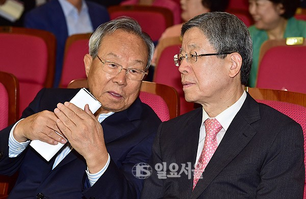 김희옥 새누리당 혁신비상대책위원장과 박관용 선거관리위원장이 14일 국회 의원회관에서 열린 제5차 전국위원회 회의에서 대화를 나누고 있다.