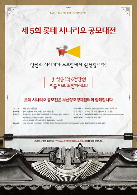 15일 롯데엔터테인먼트에 따르면 제 5회 롯데 시나리오 공모대전은 15일부터 오는 31일까지 총 17일간 롯데시네마 홈페이지를 통해 시나리오를 접수 받는데 당선작은 오는 9월 30일 롯데시네마 홈페이지를 통해 발표된다.