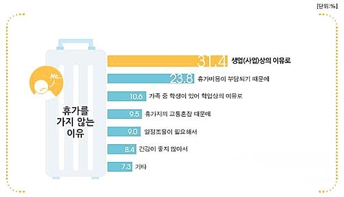 휴가를 가지 않는 원인은 ‘생업(사업)상의 이유’(31.4%), ‘휴가비용의 부담’(23.8%) 등 경제적 이유가 전체의 55.2%를 차지했다. 이어 ‘가족 중 학생이 있어서 학업상의 이유’(10.6%), ‘휴가지의 교통혼잡 때문에’(9.5%) 순으로 나타났다.