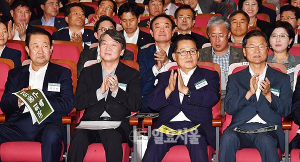 25일 오후 서울 여의도 국회 의원회관에서 열린 국회의원-지역위원장 연석회의에서 박지원 국민의당 비상대책위원장과 안철수 전 대표등이 참석 박수를 치고 있다.