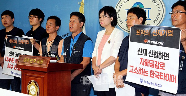정의당 이정미 원내수석부대표와 금속노조가 8일 서울 여의도 국회 정론관에서 한국타이어에 대해 '산업재해 1등 기업'이라고 비판, "노동자들이 제대로 치료를 받고 건강하게 현장에서 일할 수 있도록 보장하라"는 기자회견을 하고 있다.