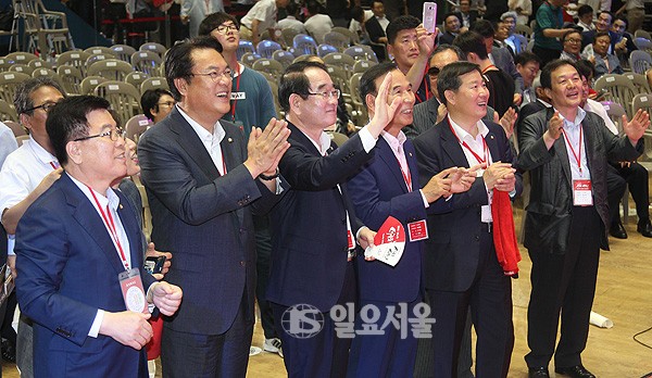 정진석 새누리당 원내대표 를 비롯한 의원들이 9일 서울 잠실실내체육관에서 열린 전당대회에서 가수 태진아씨의 공연을 보며 즐기고 있다.