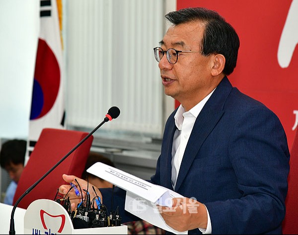 새누리당 이정현 신임 대표가 11일 오후 국회 대표실에서 청와대 오찬 브리핑을 하고 있다.