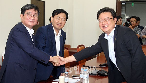 국회 정무위원회 여야 간사가 18일 오후 국회에서 만나 '조선·해운업 부실화 원인 규명 청문회'(서별관회의 청문회)와 관련한 증인 채택 문제 등을 논의하기 앞서 손을 모으고 있다. 오른쪽부터 새누리당 김성원 의원, 국민의당 김관영 간사, 더불어민주당 전해철 간사.