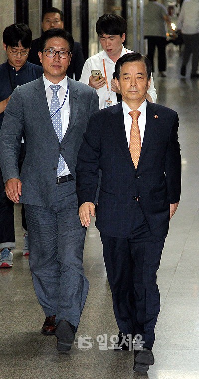 한민구 국방부 장관이 22일 국회에서 더민주 김종인 대표를 만난 후 이정현 새누리당 대표를 만나기 위해 대표실로 새누리당 대표실로 향하고 있다.