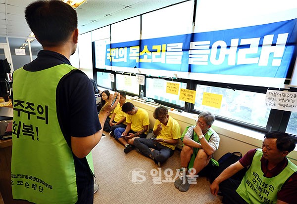 세월호 가족협의회와 백남기대책위가 25일 세월호 진상규명의 당론 채택과 특별법 개정 및 백남기농민 청문회 실시를 촉구하며 서울 여의도 더불어민주당 당사를 점거하고 있다.
