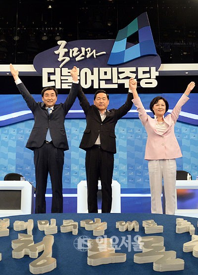 25일 서울 여의도 KBS본관 스튜디오에서 열린 더불어민주당 당대표 TV토론회에 참석한 이종걸 김상곤 추미애 후보가 포즈를 취하고 있다.