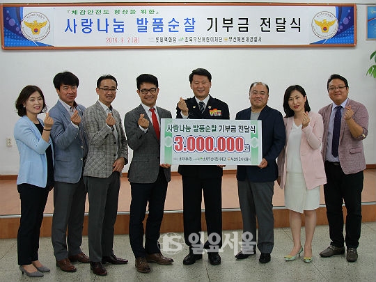 [일요서울 | 부산 전홍욱 기자] 롯데백화점 센텀시티점(점장 최 경)은 지난 2일 해운대 경찰서를 방문해 지난 6월부터 시행한 '사랑 나눔 발품 순찰' 캠페인 달성에 따른 기부금 3백만원 전달식을 개최했다.