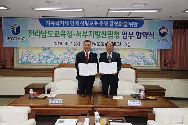 [일요서울ㅣ전남 조광태 기자] 전남도교육청은 오늘(7일) 본청 비즈니스실에서 장만채 교육감과 김영철 서부지방산림청장이 참석한 가운데 자유학기제 연계 산림교육 활성화를 위한 업무협약을 체결했다.