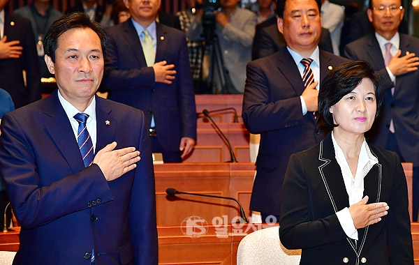 더불어민주당 추미애 대표와 우상호 원내대표가 20일 오전 국회에서 열린 의원총회에서 국민의례를 하고 있다. 정대웅 기자 photo@ilyoseoul.co.kr 저작권자 © 일요서울i 무단전재 및 재배포 금지 정대웅 기자 다른기사 보기