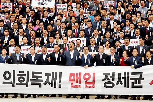 정진석 새누리당 원내대표를 비롯한 새누리당 의원 및 당원들이 28일 오후 서울 여의도 국회 본청 앞에서 정세균 국회의장 사퇴 촉구 규탄 결의대회를 열고 구호를 외치고 있다. 이정현 대표는 이날 결의대회에서 소속 의원들을 향해 "내일부터 국정감사에 임해달라"고 말하며 "자신은 정세균 국회의장이 사퇴 할 때까지 단식 투쟁을 계속하겠다"고 밝혔다.