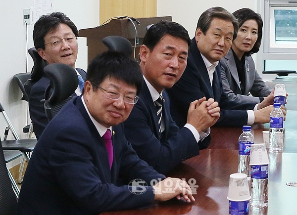 김무성 새누리당 전 대표와 유승민, 나경원 의원 등이 29일 서울 여의도 국회 의원회관에서 정국 해법 논의를 위한 긴급모임을 하고 있다. 이날 모임에는 김 전 대표와 유승민, 정병국, 나경원, 이혜훈, 김세연, 황영철, 김용태, 권성동, 주호영, 이은재 의원 등이 참석했다.