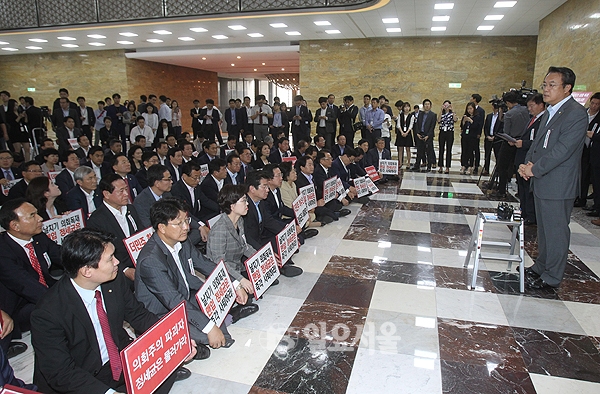 정진석 새누리당 원내대표를 비롯한 의원들이 29일 국회 로텐더홀에서 열린 의원총회에서 정세균 국회의장을 규탄하고 있다.