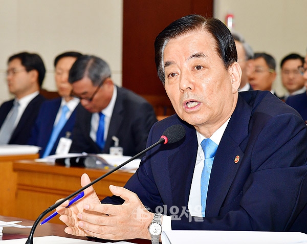 한민구 국방장관이 5일 서울 여의도 국회에서 열린 국방위원회의 국방부에 대한 국정감사에서 의원들의 사드 배치 관련 질의에 답하고 있다.