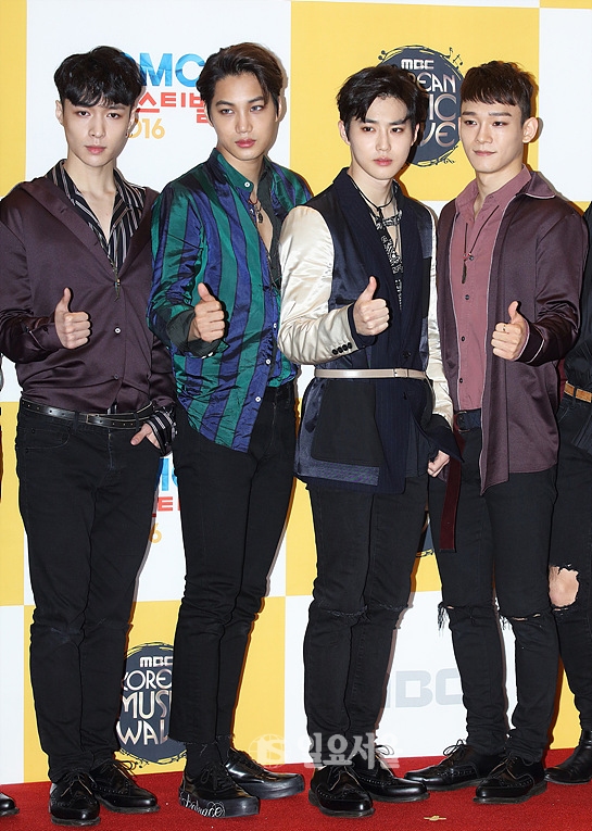 [일요서울 | 송승진 기자] 아이돌그룹 엑소(EXO) 멤버 레이-카이-수호-첸이 8일 저녁 서울 마포구 MBC 상암문화광장에서 열린 2016 DMC 페스티벌 코리안뮤직웨이브 포토월 행사에 참석해 포즈를 취하고 있다.