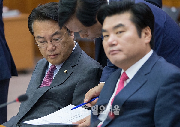 19일 오전 국가정보원에서 열린 정보위원회 국정감사에 참석한 정진석(왼쪽부터) 새누리당 원내대표, 이완영 간사, 원유철 의원이 대화하고 있다.