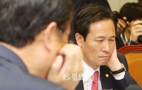 20일 국회 운영위원회 국정감사에서 여-야 의원들이 우병우 민정수석의 출석을 두고 설전을 벌이고 있는 가운데 정진석 위원장과 우상호 더불어민주당 원내대표가 생각에 잠겨 있다.