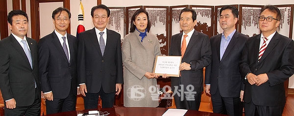 더불어민주당 박영선 의원을 비롯한 의원들이 7일 오후 서울 여의도 국회 정론관에서 박근혜 대통령의 헌정유린 진상규명을 위한 긴급현안질의 촉구 기자회견을 가진 후 정세균 국회의장에게 요구서를 전달하고 있다.