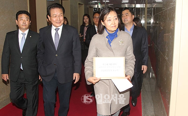 더불어민주당 박영선 의원을 비롯한 의원들이 7일 오후 서울 여의도 국회 정론관에서 박근혜 대통령의 헌정유린 진상규명을 위한 긴급현안질의 촉구 기자회견을 가진 후 정세균 국회의장실을 방문하고 있다.