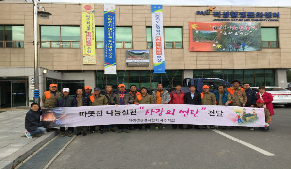 [일요서울 | 경기북부 강동기 기자] (사)야생생물관리협회 파주지회(지회장 이용찬)는 10일 따뜻한 나눔실천의 일환으로 ‘사랑의 연탄’을 소외계층에 전달했다.