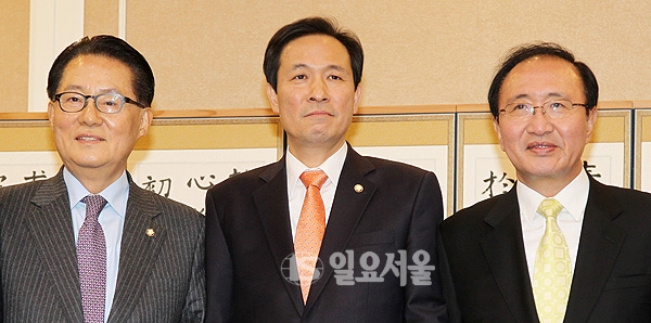 야3당 원내대표가 24일 국회에서 경제부총리 임명 문제 등을 논의하기에 앞서 인사하고 있다. 왼쪽부터 박지원 국민의당 비상대책위원장 겸 원내대표, 우상호 더불어민주당 원내대표, 노회찬 정의당 원내대표.