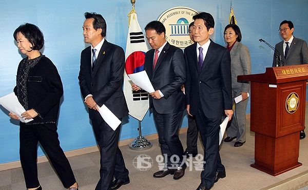 안민석 더불어민주당 의원을 비롯한 최순실 국정농단 국조특위 야당 의원들이 28일 오전 서울 여의도 국회에서 증인채택과 관련해 여당의 협조를 요구하는 기자회견을 마치고 정론관을 나서고 있다.