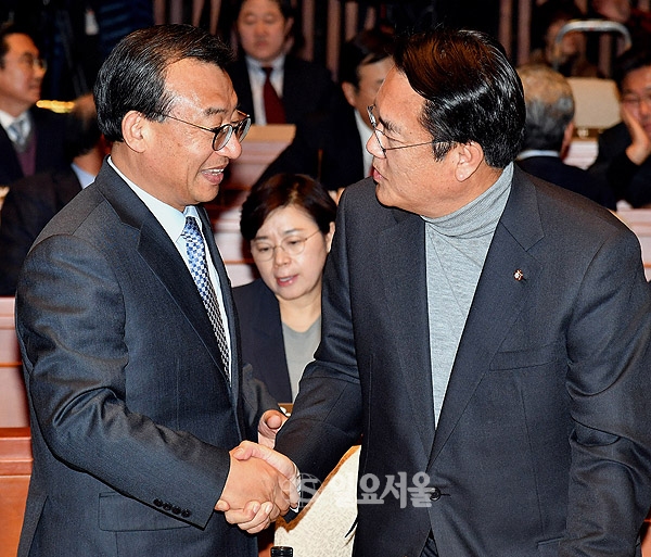 새누리당 이정현 대표와정진석 원내대표가 29일 오후 국회에서 열린 의원총회에서 인사를 나누고 있다. 정대웅 기자 photo@ilyoseoul.co.kr 저작권자 © 일요서울i 무단전재 및 재배포 금지 정대웅 기자 다른기사 보기