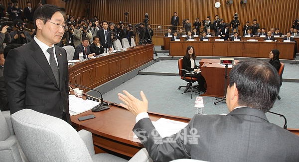 30일 국회에서 열린 '박근혜 정부의 최순실 등 민간인에 의한 국정농단 의혹 사건 진상 규명을 위한 국정조사 특별위원회' 전체회의에서 김성태 위원장과 박범계 더불어민주당 간사가 언쟁을 벌이고 있다.