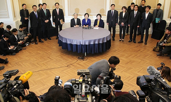6일 오전 국회에서 열린 야3당 대표 회동에서 김동철 국민의당 비상대책위원장, 추미애 더불어민주당 대표, 심상정 정의당 상임대표(왼쪽부터)가 인사를 나누고 있다.