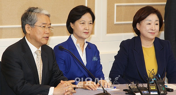 6일 오전 국회에서 열린 야3당 대표 회동에서 김동철 국민의당 비상대책위원장, 추미애 더불어민주당 대표, 심상정 정의당 상임대표(왼쪽부터)가 발언하고 있다.
