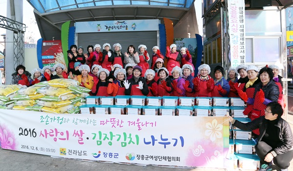 [일요서울ㅣ전남 김도형 기자] 전남 장흥군 여성단체협의회(회장 강연금)가 6일 토요시장 토산품판매장에서 ‘사랑의 쌀·김장김치 나누기’ 행사를 개최했다고 밝혔다.