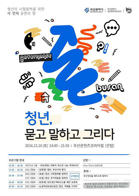 [일요서울 | 부산 이상연 기자] 부산시는 10일 오후 2시 센텀콘텐츠코리아랩에서 ‘청년의 시정 참여를 위한 세 번째 공론의 장’ <부제: 청년, 묻고 말하고 그리다> 을 개최한다고 밝혔다.