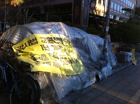 오후 8시 서울 여의도 국회의사당 주변. 시국이 시국인 만큼 국회 앞 주변에는 각종 집회로 사람들이 모여 있었다. 이들 부부의 농성장은 국회의사당 정문에서 100m 떨어진 지하철역 주변에 위치해 있다. 사람들은 분주하게 왔다 갔다 했지만 이들의 삶의 공간에 눈길 주는 사람은 드물었다. 텐트 옆에 ‘한국대학교육협의회는 강사 교원 신분 회복한 강사법 즉각 인정하라’는 문구가 적힌 팻말이 눈에 띄었다.