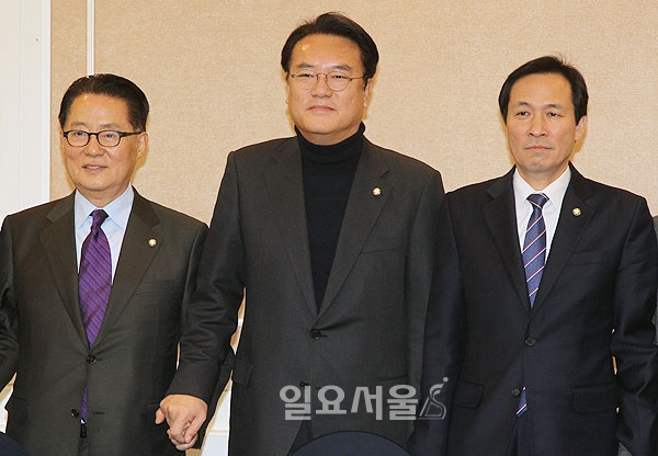 3당 원내대표가 12일 국회 귀빈식당에서 임시국회 일정과 여야정 협의체 구성 등을 논의하기 위해 회동하고 있다. 왼쪽부터 국민의당 박지원, 새누리당 정진석, 더불어민주당 우상호 원내대표.